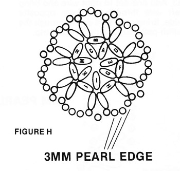 34. Add one oat and one 3mm pearl to wire. Go through one 3mm pearl on top edge of table top. Add one 3mm pearl and one oat and go through oat in table center (Figure H). Add one oat and one 3mm pearl. Skip three 3mm pearls in outside edge of table and go through next 3mm pearl. Add one 3mm pearl and one oat and go through oat in table center again.